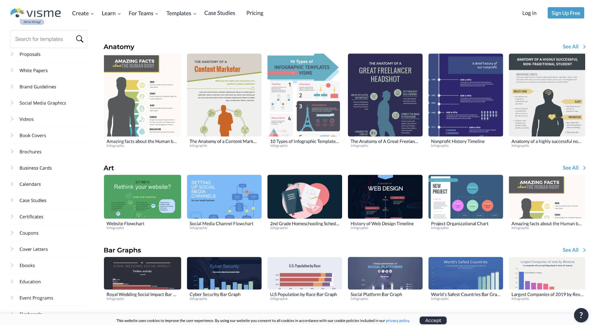 Ook biedt Visme ook een breed scala aan sjablonen en ontwerpelementen, zoals grafieken, diagrammen en pictogrammen. Je kunt Visme ook gebruiken om interactieve quizzen, enquêtes en formulieren te maken, die kunnen worden gebruikt voor beoordelingen of voor het verzamelen van gegevens voor onderzoeksprojecten.